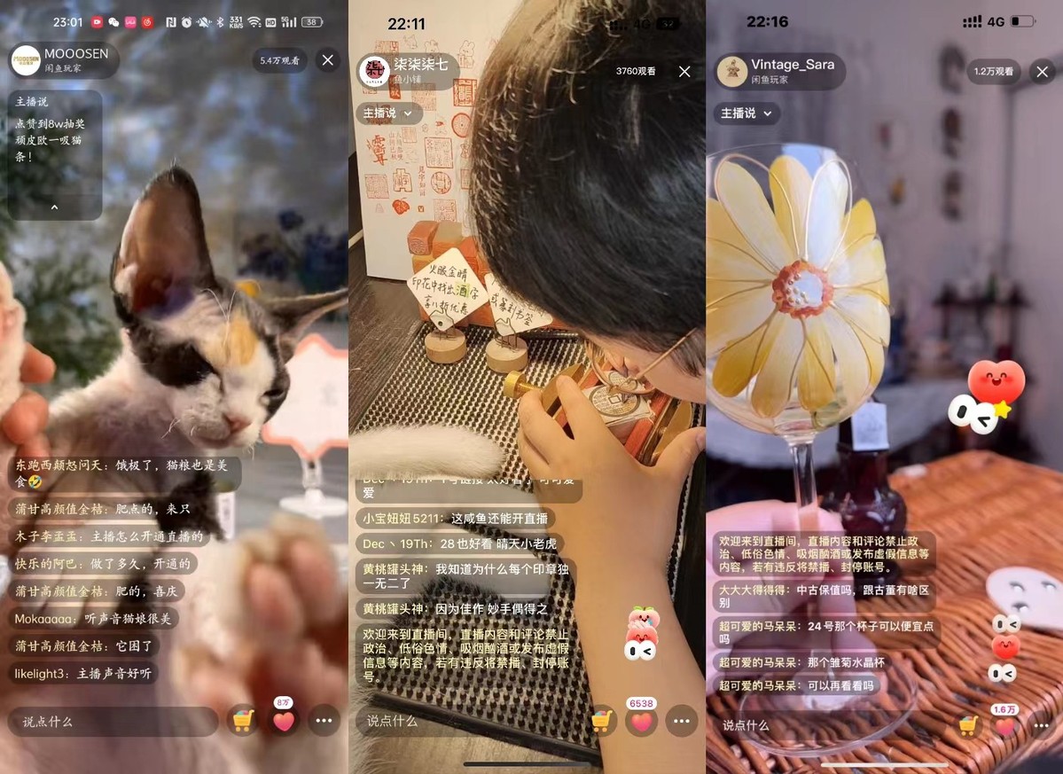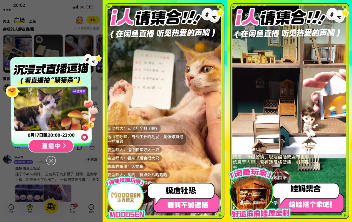 (图说:闲鱼首场玩家直播,达人们沉浸式撸猫、刻章、展示中古收藏)