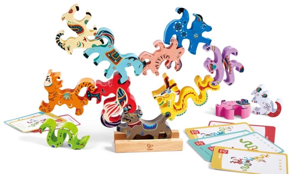 以十二生肖为主题,敦煌飞天壁画为灵感来源,采用外观专利,可实现积木勾,挂,套,叠等玩法,拼搭出丰富多彩的造型。