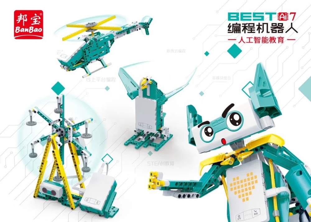 蓝牙遥控小程序,支持多编程语言的AI智能机器人模块,15个奇趣造型课例,满足STEAM教育需求。