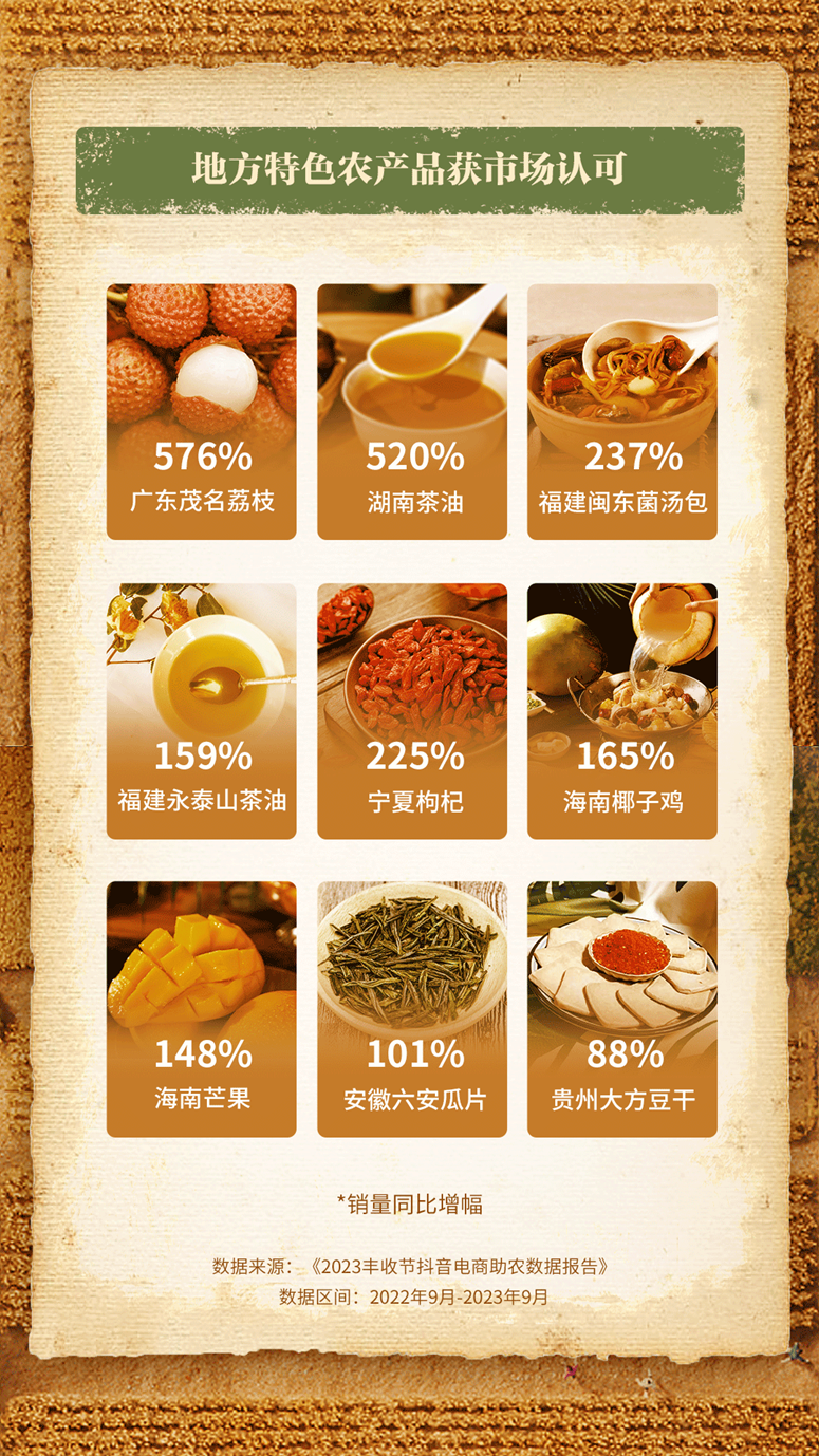 地方丰饶物产,受到了平台消费者的青睐。甘甜多汁的广东茂名荔枝、浏阳蒸菜的“点睛之笔”湖南茶油、融合多种菌类的福建闽东菌汤包,皆在抖音电商里销量高涨,同比增幅分别达到576%、520%和237%。此外,宁夏枸杞、海南椰子鸡、安徽六安瓜片、贵州大方豆干等地方代表性农特产,也获得了更大的销售市场。