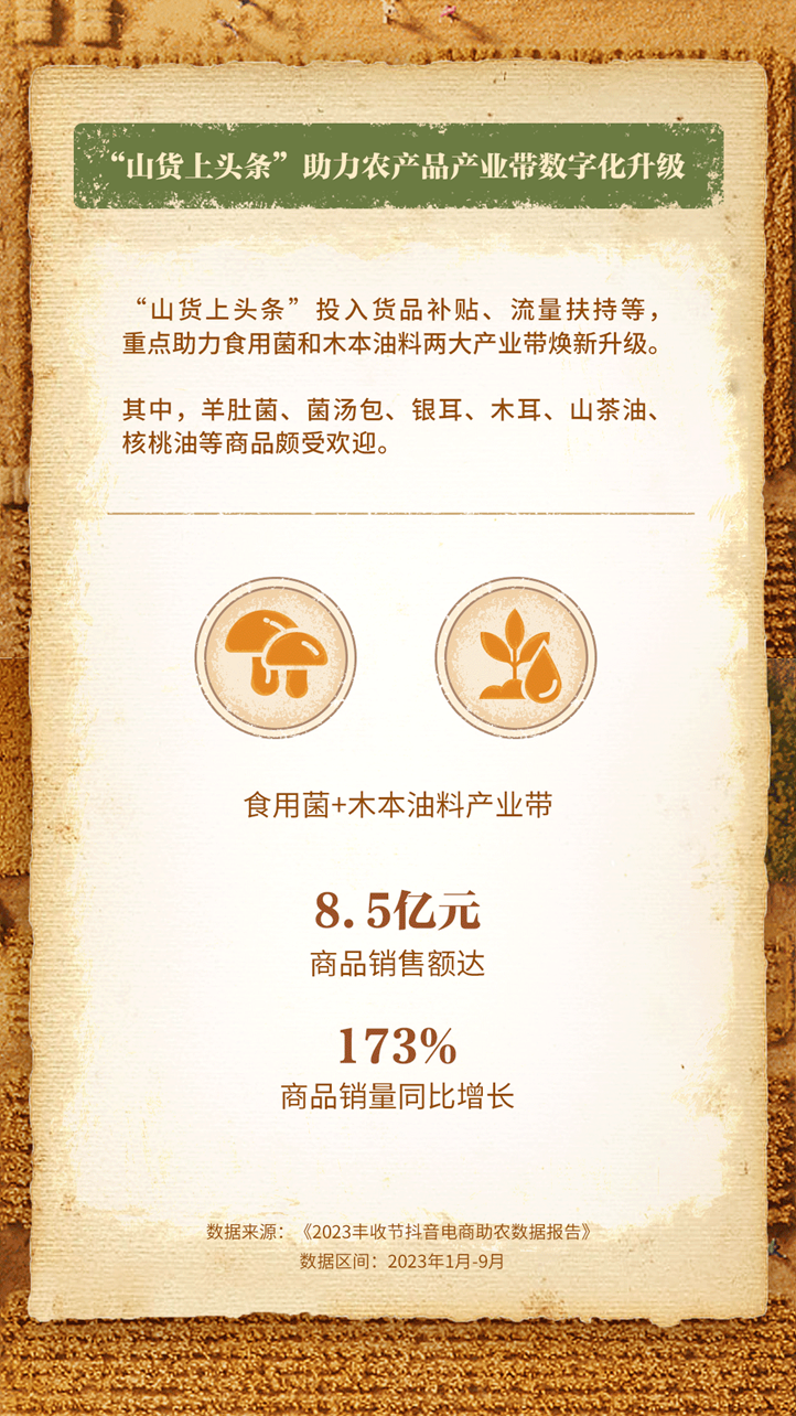 今年,抖音电商在助农上不断深入,通过“山货上头条”专项助力农产品产业带数字化焕新升级。该项目在食用菌和木本油料两大产业带上展开重点调研及专项扶助,投入货品补贴、流量扶持、商家培训等,在渠道拓展、品牌打造、产销对接等方面不断助力,完善产业链条。
