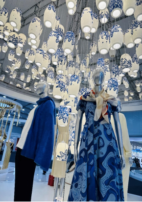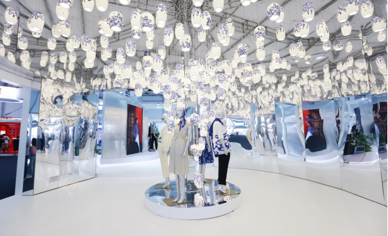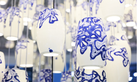 300个来源于大型空间场景艺术作品《花的三重境》纹样设计的青花薄胎陶瓷吊灯从地面中心向天顶边缘蔓延,充满着破土而生的蓬勃之力;圆形展厅的四周由镜面环绕,映射出中心的陶瓷装置,玉壶光转,人影参差——这便是恒源祥集团在9月26日至10月2日期间举办的“2023世界设计之都大会”中呈现的艺术装置生活美学作品《花的三重境·繁光》。