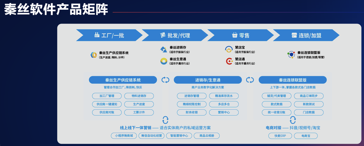 这些产品已经赋能众多商户实现数字化转型,大幅提升了管理和运营效率。来自湖州的王女士创业开童装店,生意越做越好。然而,随着规模扩大,面临着库存对不上、利润算不准、会员不好做等问题。借助秦丝进销存产品,王女士实现了包括采购进货、销售开单、打单发货、库存管理和财务分析在内的线上管理,效率大大提升。来自东莞的梁先生则选择创立了内衣品牌,并迅速发展成连锁,一年内门店扩张到30家。但店与店之间路程远、数据也不互通,查账要耗费大量时间精力,工作开展效率低。得益于秦丝连锁联盟版产品,在手机上就能实时了解每个门店的具体经营情况,轻松实现连锁加盟店管理。另外,来自深圳的宝妈麦女士创业9年,从事品牌代理生意,一个人撑起了数千万销售额的同时,也遇到了账目易出错的难题。通过使用秦丝进销存产品,麦女士实现了一键下单、自动记账,工作更加顺畅轻松。