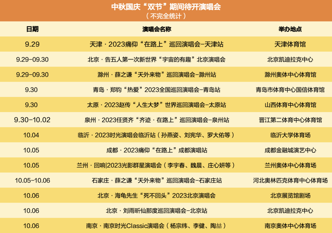 就已公开发布的演出项目和中国演出行业协会演出票务信息采集平台实时数据,在即将到来的中秋国庆“双节”,各大专业剧场、演艺新空间、演唱会、音乐节以及旅游演艺项目都呈积极上升态势。据不完全统计,中秋国庆“双节”期间,包括告五人、薛之谦、郑钧、任贤齐等组合或歌手的演唱会,还将在北京、天津、青岛、成都等地火热开启。