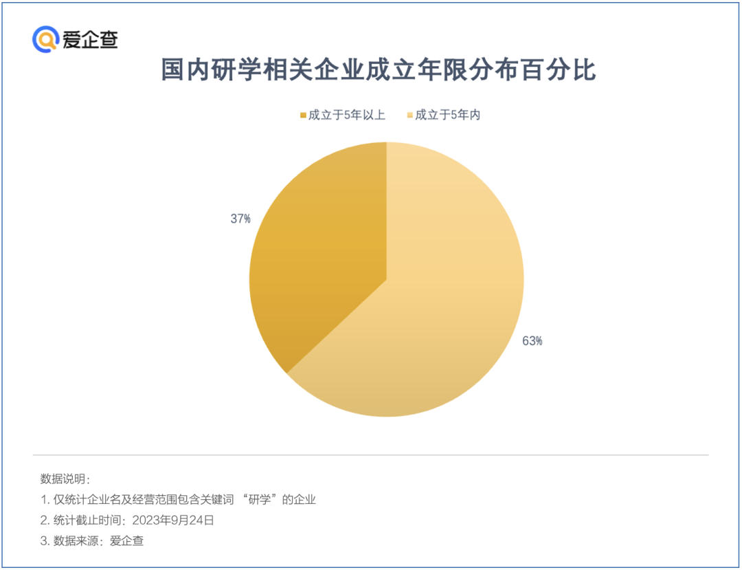 据爱企查APP显示,截至目前,我国现存 “研学”相关企业超4万家,在政策和市场的双重利好推动下,2023年1-9月新增注册企业2000余家。从成立时间及企业类型来看,超六成的相关企业成立于近5年内,且属于有限责任公司。