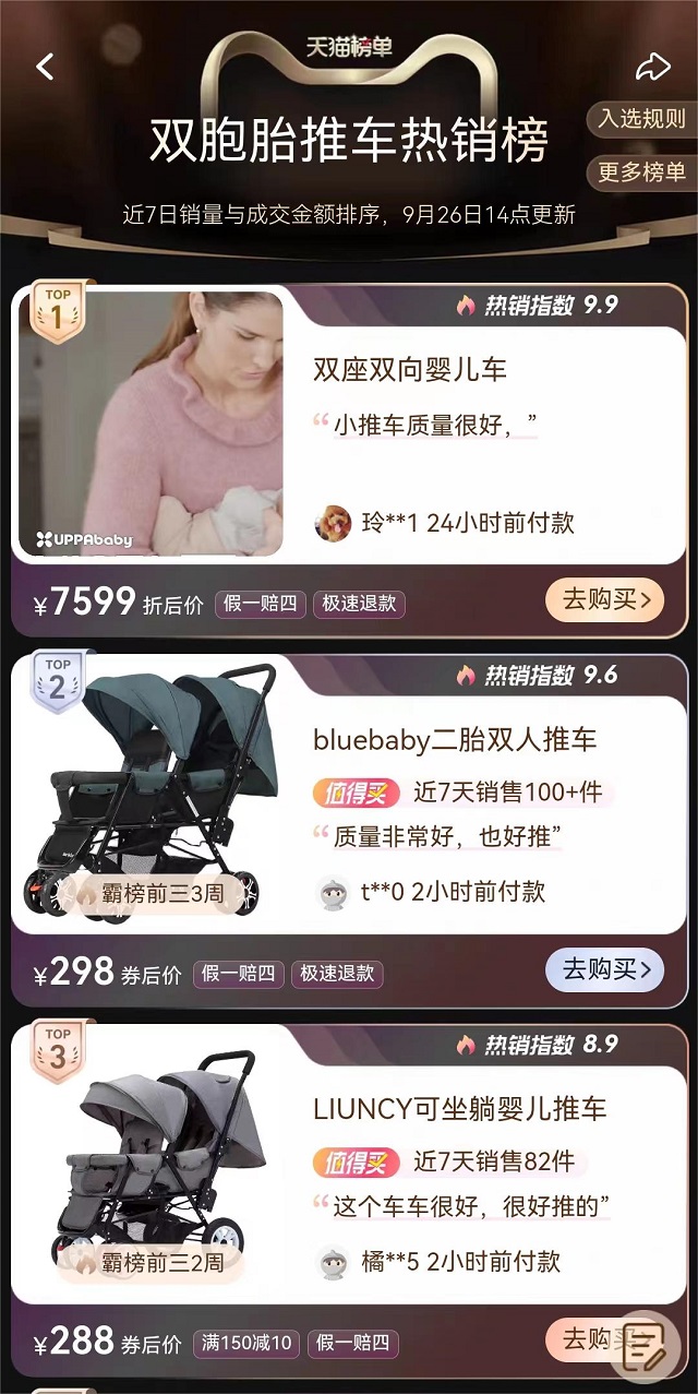 正如他们的品牌标语——UPPAbaby婴儿车,宝宝自己的“SUV”。超值乘坐体验、过硬的产品实力,让UPPAbaby在来到国内初始,就有很多知道或使用过这个品牌婴儿车的宝妈自发为它打call。且正式入驻国内两年,在天猫平台,每每逢618、双11大促,UPPAbaby在婴儿车榜单也是名类前茅,价格均价在4-5千的婴儿车,其实并不便宜,但依然有这么多人愿意买单,可见其产品在很多家长心中是有着不可撼动的地位。