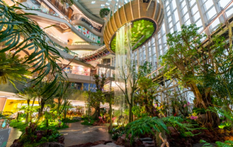 提到两江新区,也不得不提到光环购物公园,这里的“沐光森林”多次火上央视新闻联播,在高达42米的玻璃穹顶下,6000㎡室内植物空间、25米高的室内景观瀑布、7万余株自然植物,将商业功能与城市功能、自然生态完美融合。
