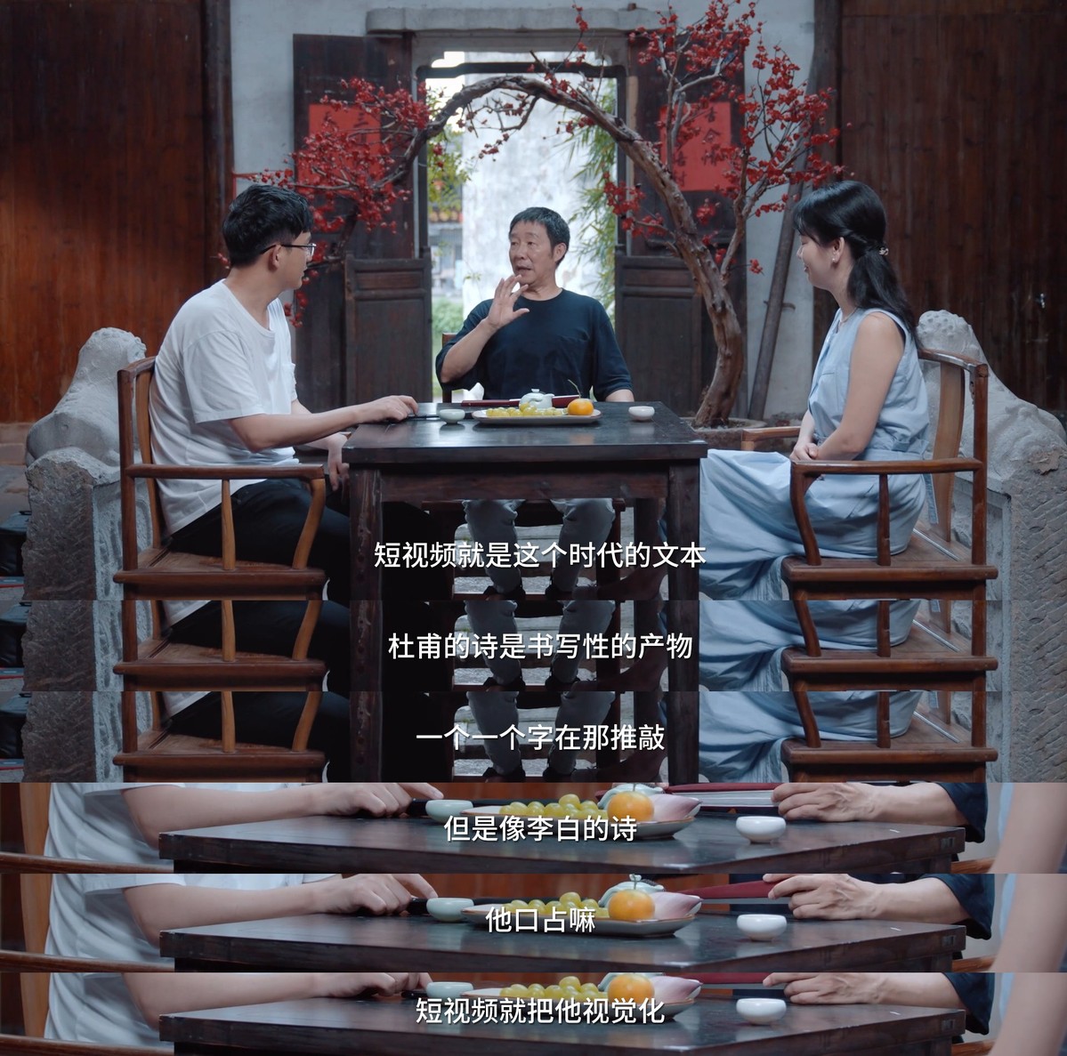 欧阳江河说,自己已经写了 40 多年的诗,回头来看自己的写作,乃至预测自己未来的写作时,也非常清楚的知道自己对自己影响最大的,还是中国古典诗词里那些诗意。“可以说说,它构成了我,解答了‘我从哪来,我是谁,我要到哪去’的问题,帮助我完成了自我身份的指认。”在他看来,李白、杜甫、韩愈等唐代诗人是用文字记录自己的时代,他们处理时代的方式、从生活中提炼出来的诗意,至今也不会过时。而短视频则将我们当代的生活视觉化,从这个意义上来说,短视频就是这个时代的文本。