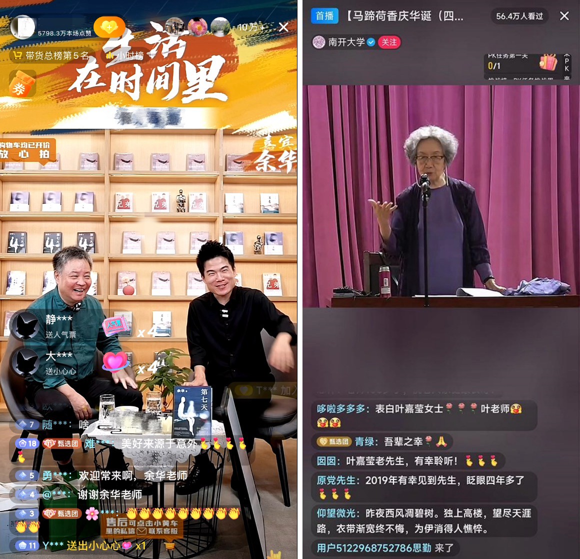 除余华和叶嘉莹外,复旦大学中文系教授梁永安以“爱情这门课,你可别挂科”为主题,在抖音为网友献上了一场有关爱情的开学公开课,累计吸引了超百万人围观;南京大学教授杜骏飞则为直播间网友带来一堂“常识课”,用理性与知识帮助当代年轻人破解青春、学业、职场与情感的迷惘;在@北京大学出版社 直播间,戴锦华、林毅夫等8位资深教授则向网友分享了8本学科名著图书,带领大家研读图书内容背后的知识真谛,推动通识知识的普及。