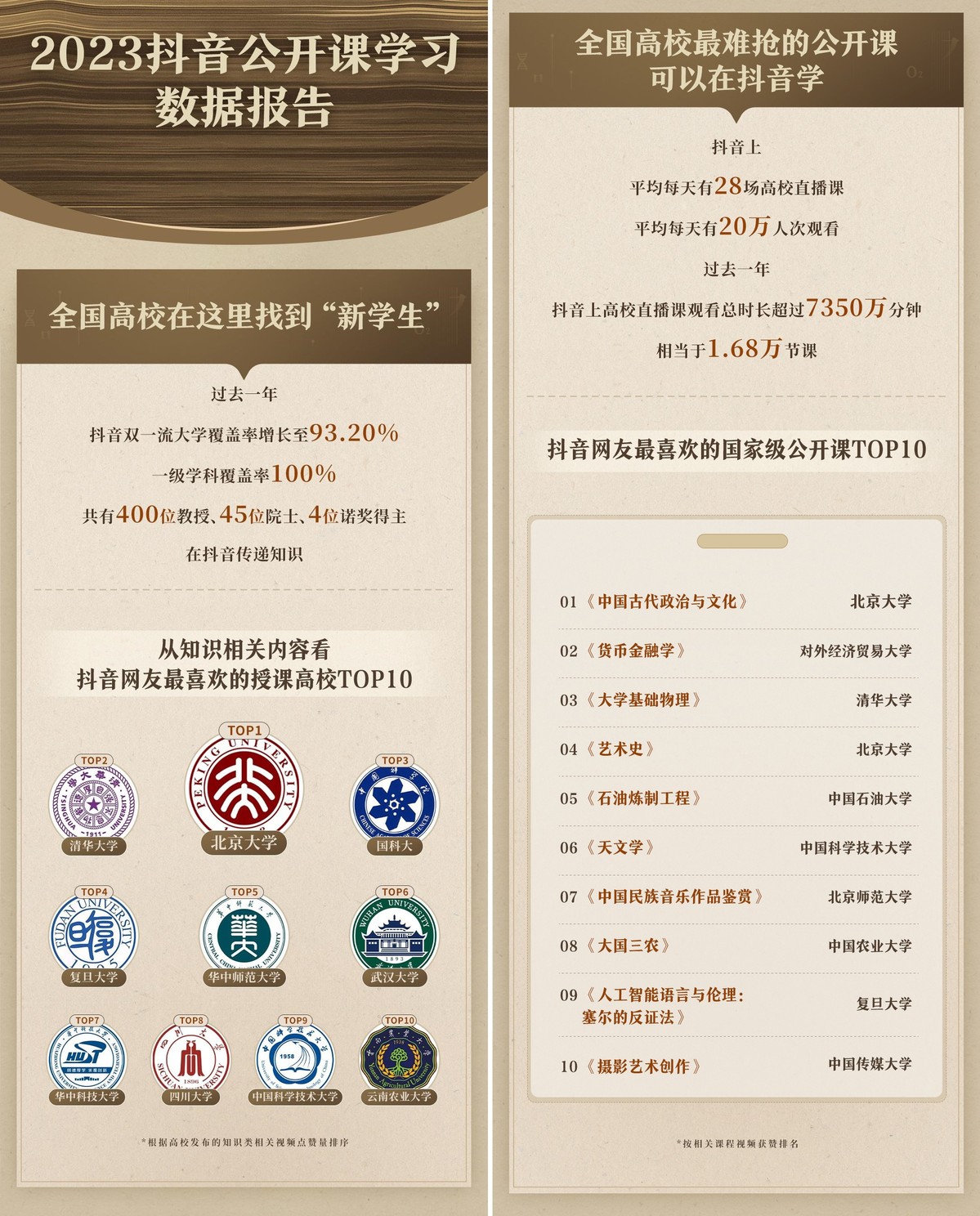 随着短视频和直播的普及,抖音已成为很多网友学习知识的新阵地。《2023抖音公开课学习数据报告》显示,过去一年,国内高校在抖音累计直播1万场,平均每天28场,总时长超过7350万分钟,相当于1.68万节课,网友观看超10亿次。抖音双一流大学公开课覆盖率增长至93.2%,一级学科覆盖率100%,包括45位院士、4位诺奖得主等在内的各路大咖在抖音开讲。
