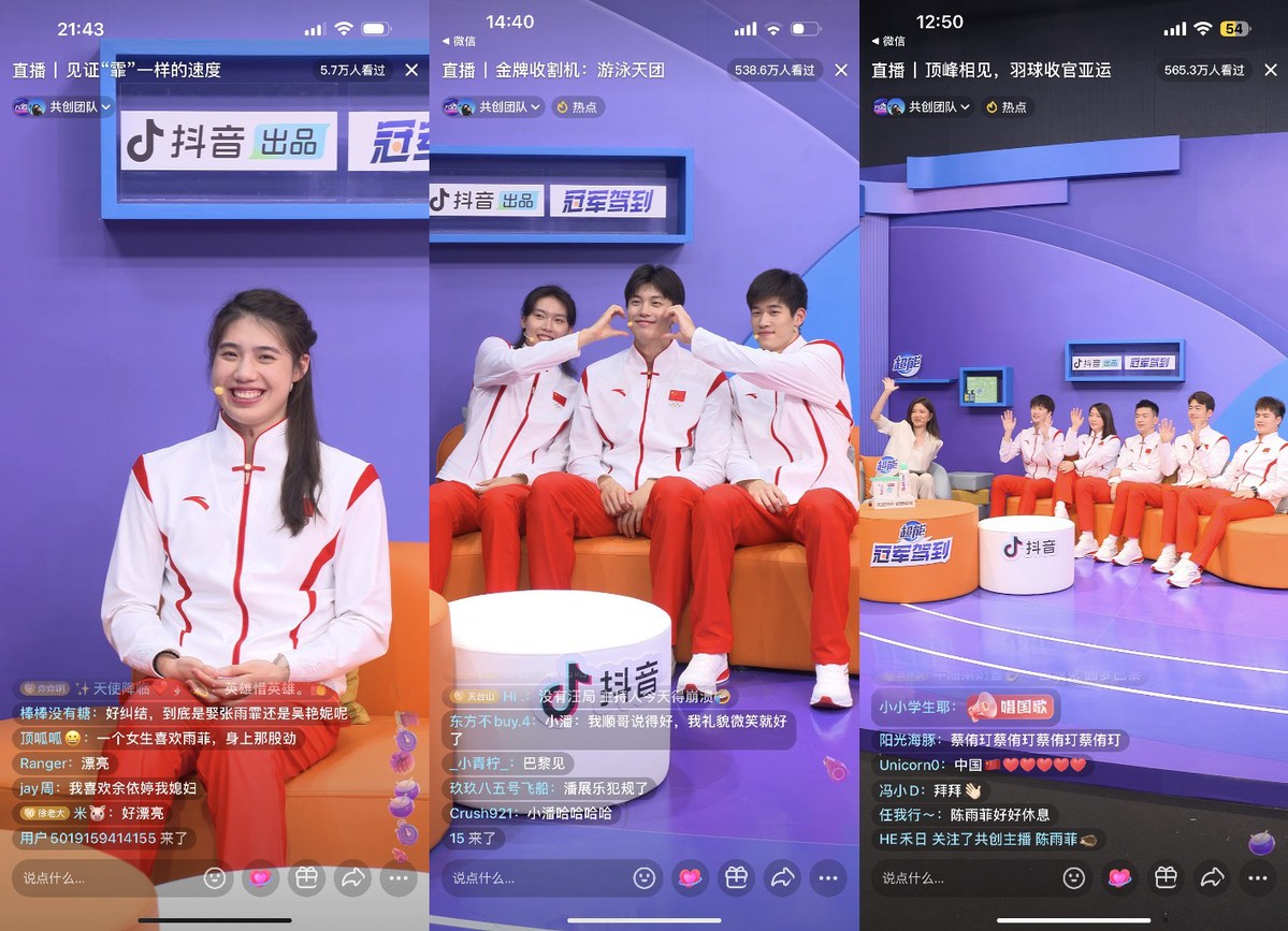 除了团结一心的中国乒乓球队,其他受邀来到直播间的运动员和嘉宾们,也展现了他/她在场下的另一面。横扫游泳项目、刷新亚运最佳战绩的中国游泳选手汪顺、潘展乐、杨浚瑄在直播中齐跳whatever萌翻观众;100米栏亚运金牌选手林雨薇在谈到恩师时几度哽咽,泪洒直播间,让观众看到了这位新晋“田径女王”的感性一面;本届亚运会的MVP选手张雨霏则表示自己是在发烧的状态下,坚持参赛并横扫6枚游泳项目金牌,让网友大呼这是绝对实力的碾压。