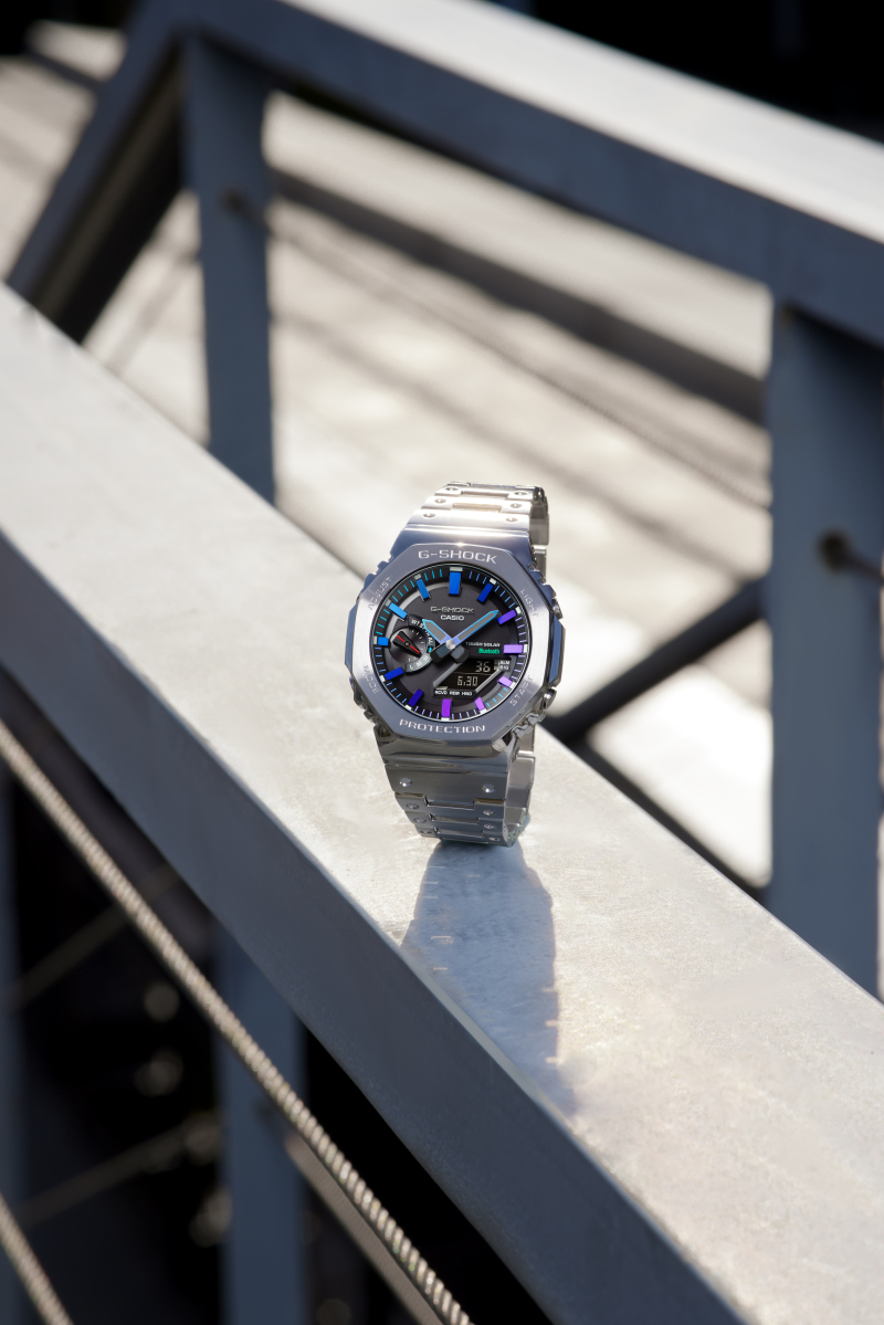 GM-B2100PC-1A的银色表身定格高级金属质感,蓝紫渐变映衬棱角锋芒,在八角表盘间舒展不羁想象。