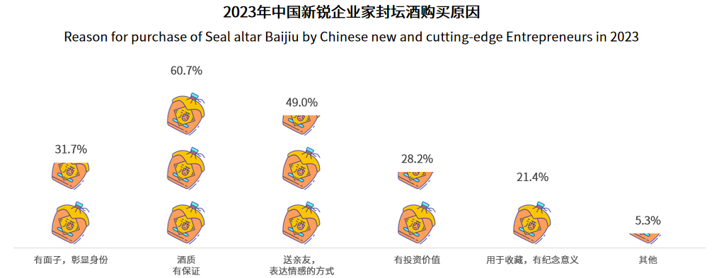 iiMedia Research(艾媒咨询)调研数据显示,新锐企业家购买封坛酒的原因是酒质有保证(60.7%),送亲友以表达情感(49.0%),有面子、彰显身份(31.7%)等。封坛酒因特殊的酿造工艺、存放年限长,口感口味相对更加丰富,酒体质量有一定的保障。封坛酒集功能价值、投资价值、收藏价值于一体,并充分满足人们精神和物质层面的双重需求,不仅是一种情感的表达,更是一种身份的象征。