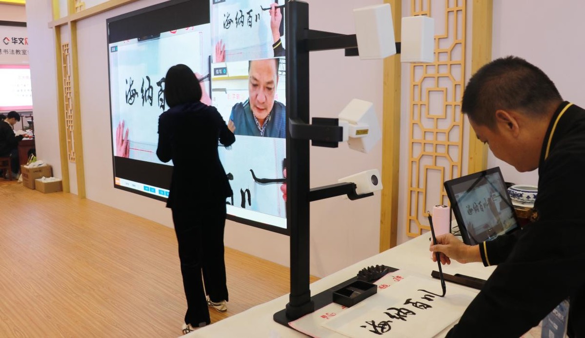工作人员在现场进行展示,“展示环节,我们采用虚拟展示技术,现实场景和虚拟场景相结合,一方面可以通过展示对学生进行激励,另一方面,学生毕业多年后仍然能在母校的虚拟展馆中找到自己的书法作品。”,华文众合第8代智慧书法教室利用科技创新赋能传统课堂,让书法教学五环节更轻松、更智能。