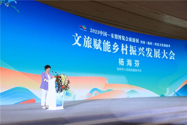 桂林市人民政府副秘书长杨海芬代表桂林市副市长郑平出席大会并致辞。杨海芬指出,桂林作为打造文化旅游名城,有着丰厚的文化底蕴和丰富的旅游资源;乡村振兴,是我国当前的重大国家战略,文旅产业作为一种朝阳产业,拥有巨大的发展潜力,桂林很多乡村具有农文旅融合发展的禀赋,文旅可以为乡村振兴注入新的活力和更多的动力。