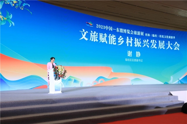 临桂区委副书记谢静代表承办方致辞。谢静说,在桂林临桂桂花文化旅游季举办期间,临桂区能参与举办这场凝聚乡村文旅领域的领导、专家、企业家以及一线工作者力量和智慧的盛会,具有深远的时代意义。以“文旅+乡村振兴”为主题,以乡村一二三产业融合发展为方向,以打造乡村“城市会客厅”为契机,整合“全域旅游+乡村振兴”新模式,大会以“媒体宣传+专业观众”为文旅赋能特色乡村模式加持,必将为我区文旅产业和乡村振兴蓬勃发展起到积极的推动作用。
