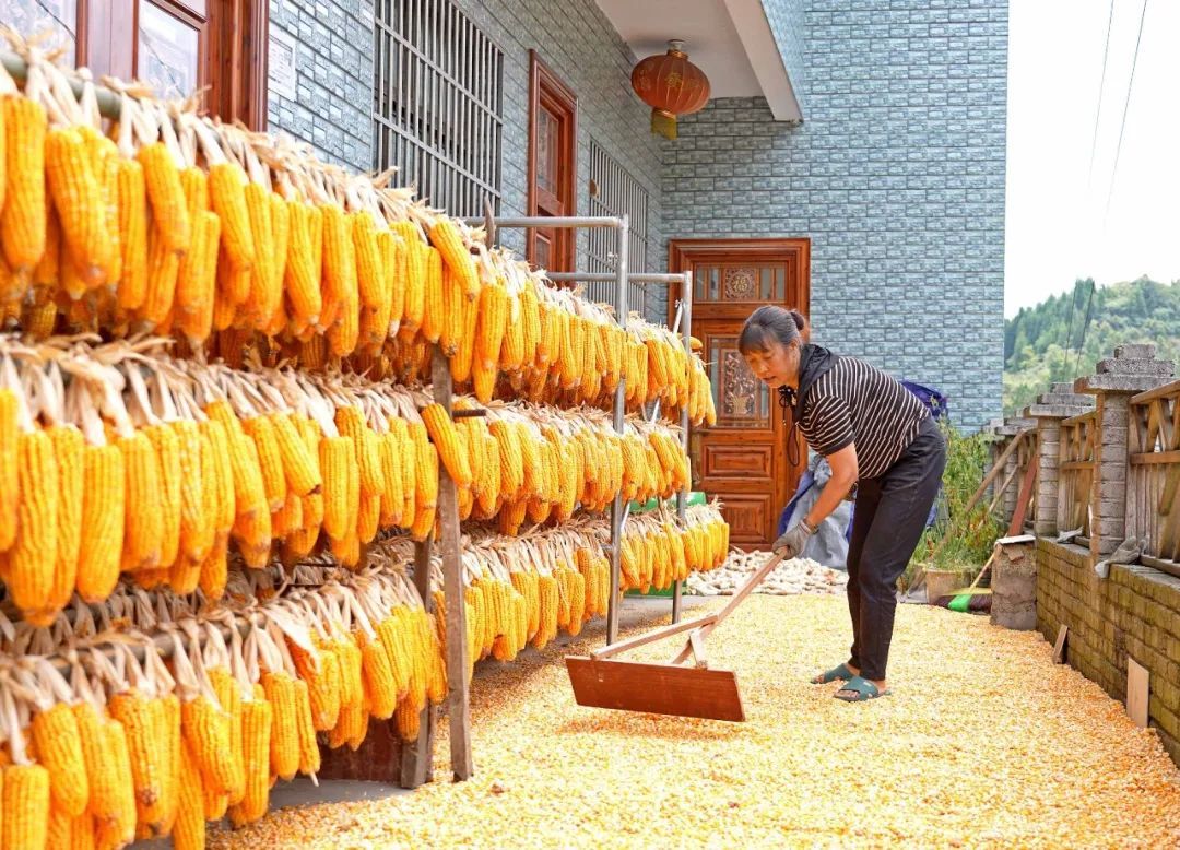 在纳雍县新房乡,村民房前屋后晾晒着的金黄色玉米,成了乡村最靓丽的一道风景线。
