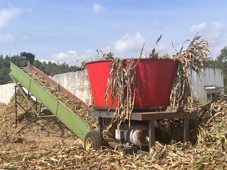 (2023年9月11日,在纳雍县乐治镇家车村玉米秸秆回收站点,粉碎机正在粉碎玉米秸秆。包文飞 摄)