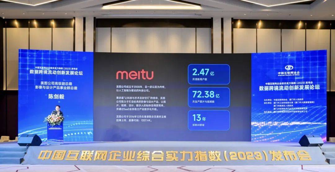 10月26日,中国互联网企业综合实力指数(2023)发布会现场,美图公司高级副总裁、影像与设计产品事业群总裁陈剑毅进行了《AI助力美图全球化增长》的主题演讲。