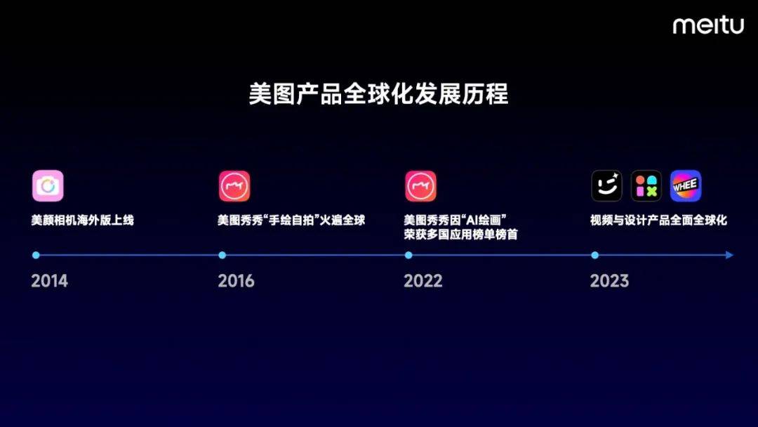 陈剑毅回顾了美图影像与设计产品全球化发展历程:2014年美颜相机海外版上线,2016年美图秀秀手绘自拍火遍全球,2022年美图秀秀凭借“AI绘画”功能登上多国应用榜首,2023年视频与设计产品全面全球化。