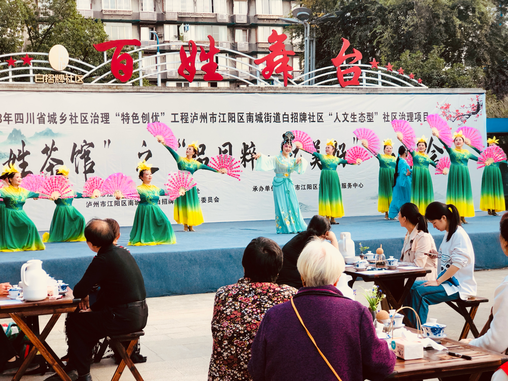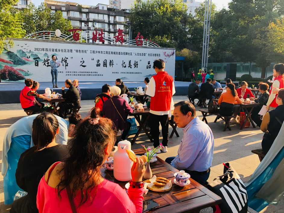 初秋的白招牌社区迎来了第一场“百姓茶馆”之“品国粹·忆美好”品茶会,本场品茶会是白招牌社区创建“人文生态型”社区中“历史可变迁”版块的呈现载体,由泸州市江阳区人民政府南城街道办事处、泸州市江阳区南城街道白招牌社区居民委员会主办,泸州市江阳区星星社会服务中心承办。活动邀请了江阳区民政局副局长何明楷,南城街道办事处副主任黄耀琼,南城街道社事办副主任杨西林,白招牌社区党委书记兼居委会主任叶健,白招牌社区“社区规划师”等60余人,一同品尝初秋的第一碗茉莉花茶。