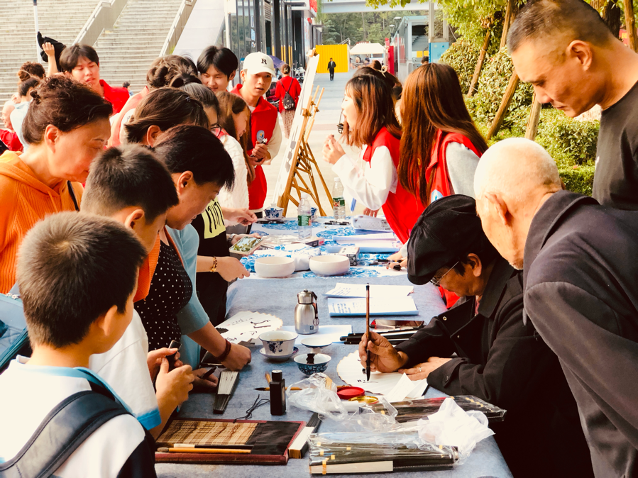 在茶会现场,还见“社区规划师”成员彭天一老师提笔挥墨,为现场的茶友们制作茶礼——手工书法扇,只见笔尖墨色彩如画,每一次起笔、每一次收笔,悦目又怡神。“一茶一世界”“茶香袅袅”是彭老师对茶文化的理解,“清新隽永”“宁静致远”是茶友对茶文化的镌刻。书法作为中国的四大国粹之一,汉字的书写艺术形成了中国书法的独特风格,它不仅是一种艺术形式,更是一种文化传承的方式、一种精神的追求和表达方式。彭老师以书法会茶友,篆刻出对“品国粹”独特的理解。