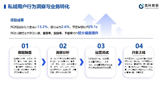 私域运营已经是当下企业了解用户不可或缺的部分,为了高效挖掘数据价值,企业需要经历数据探查、洞察分析、运营测试、开发上线等过程。在实际案例中,通过对用户私域数据的全流程洞察后,企业的定制化活动短信实现了链接点击率高达13.2%,留资率2.6%,页面停留时间29.1s,远超平均水平。最终让留资率、到店率、下定率有较大幅度的提升。