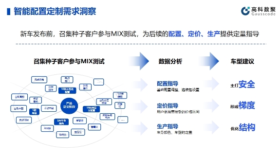智能配置的有效应用可以帮助企业提升产品和服务的智能化水平。在实际应用中,高科数聚帮助车企在新车发布前召集种子客户参与MIX测试,通过收集种子客户的反馈和数据,车企能够精细调整产品配置,为后续的配置、定价、生产提供定量指导。同时,这种方法不仅有助于提高产品质量,还能提前发现潜在问题并及时解决。