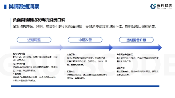 舆情洞察已经成为当下车企关注的重点内容,其中汽车召回、自然等负面舆情更是用户关注的焦点。以某品牌发动机共振、异响、噪音等问题引发负面舆情为例,舆情发生后导致消费者对该品牌印象不佳,影响品牌口碑和汽车销售。对此,企业需要从近期调整、中期改善、以及远期更替升级三大板块应对舆情,从产品本身的改善升级,舆情的梳理和危机处理,以及企业声誉维护等多维度对舆情进行应对。