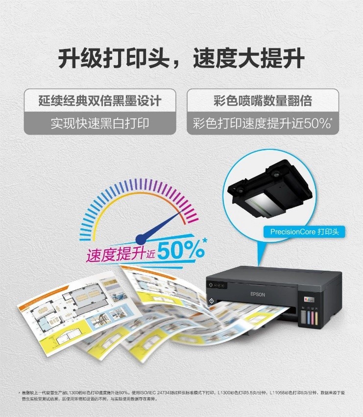 *1是指较上一代爱普生产品L1300的彩色打印速度提升近50%。使用ISO/IEC24734测试样张标准模式下打印,L1300彩色打印5.5页/分钟,L11058彩色打印8页/分钟,数据来源于爱普生实验室测试结果,因使用环境和设置的不同,与实际使用数据存在差异。