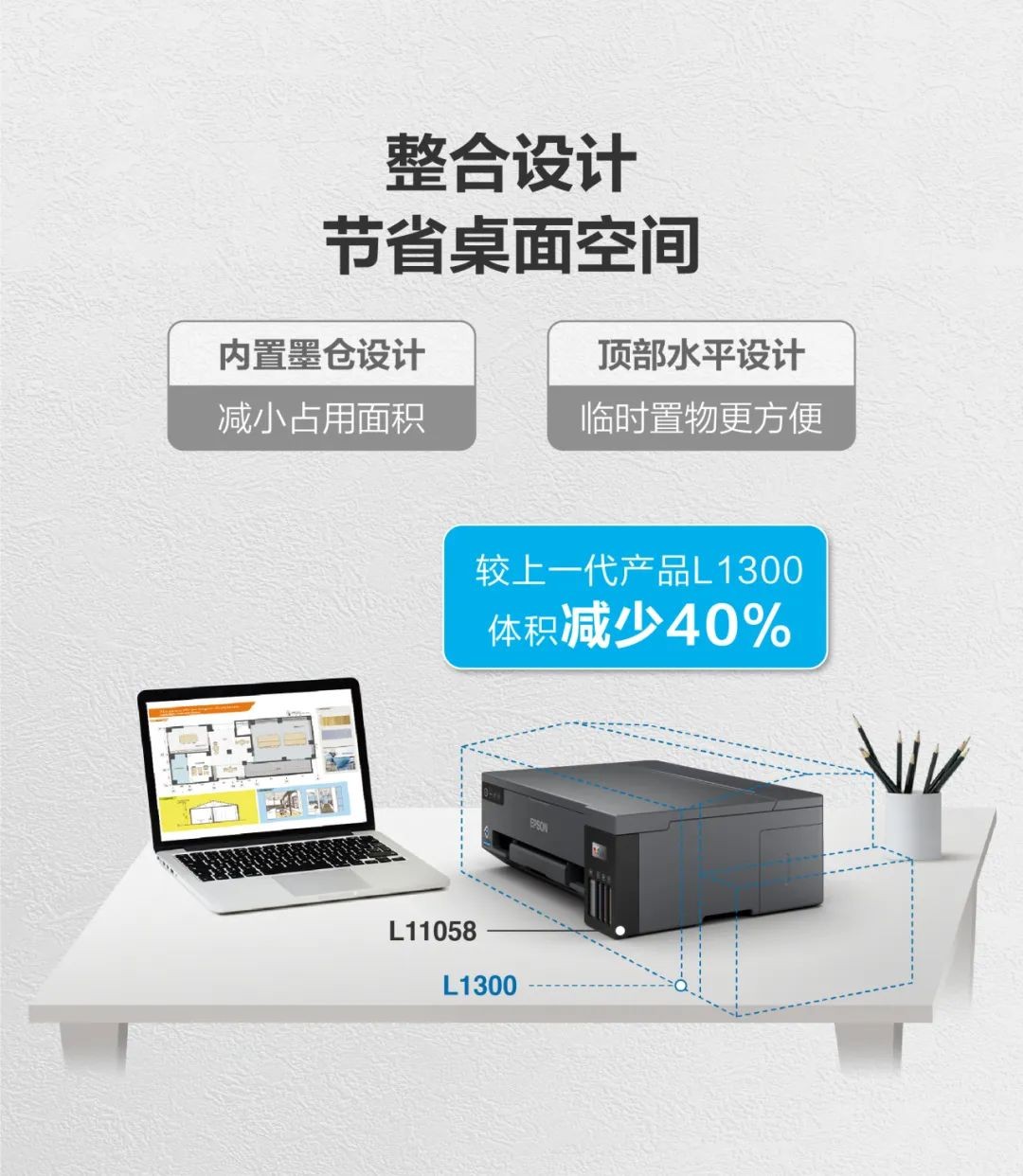 爱普生4色A3+墨仓式新品L11058以高集成度完美平衡用户对于打印机的摆放需求,既节省了空间,又创造了临时置物空间,可谓一举两得!
