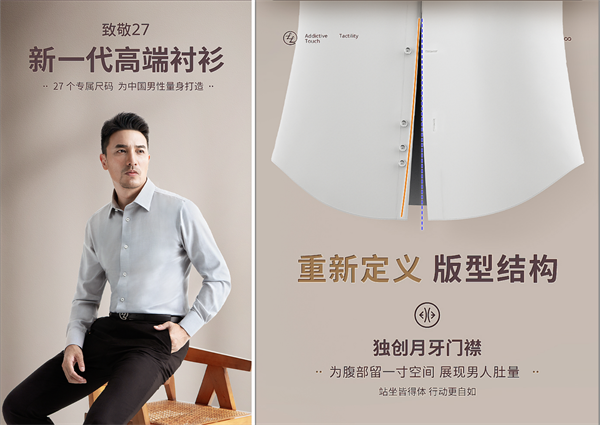 目前国际市场中大部分品牌的衬衫尺码集中在6-8个,衬衫老罗在深入研究中国男性的体型和行为习惯后,进行了多次市场调研,团队历时一年多,基于12000份来自用户的真实形体数据样本,经过1300次版型调整,最终打造了27个中国男士专属尺码的战略单品——致敬27,彻底破解中国男性着装痛点。