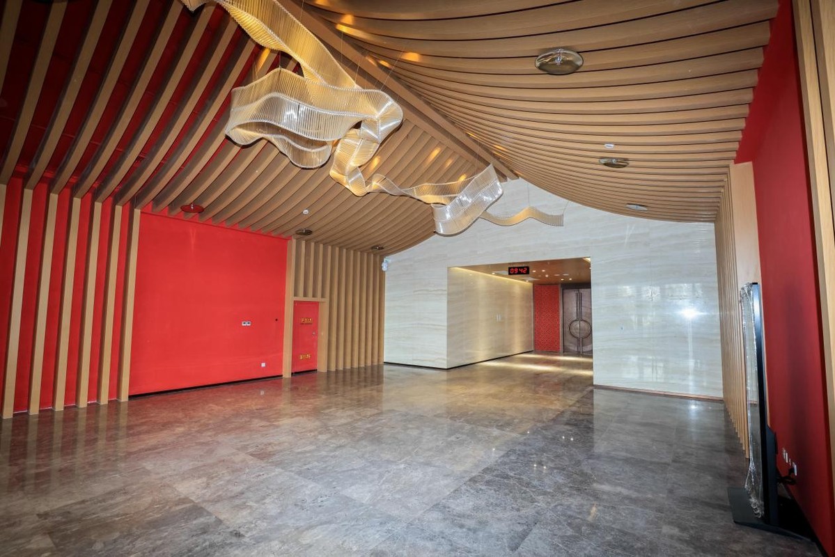 VIP门厅弧形顶采用弧形铝单板整体吊装施工,弧形铝单板与弧型镂空板的搭接拼装,烘托了重点区域的文化氛围,厅内规整的地面与错落有致的立面空间完美融合,以简洁大气的造型手法,形成虚实、序列的韵律空间。