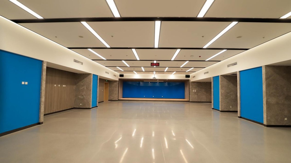 新闻发布厅延续了主空间简洁明快的设计手法,运用不锈钢灯槽界定顶部空间,营造纵深感、延长空间感,墙面陶铝吸音板确保吸音功能完善,整体空间恢弘大气、动感十足。