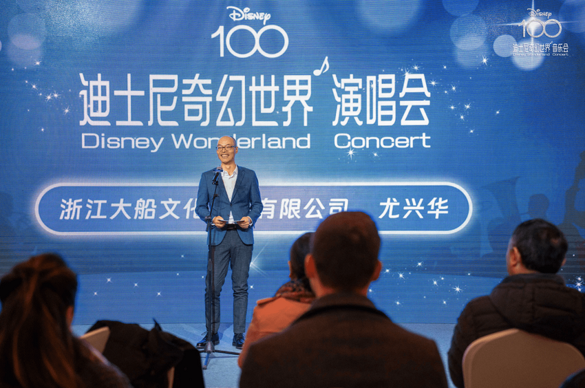 作为全程巡演主办方,大船文化董事尤兴华首先上台致辞,分享了大船文化与迪士尼奇幻世界演唱会双向奔赴的故事,表达了对巡演的热烈期盼。