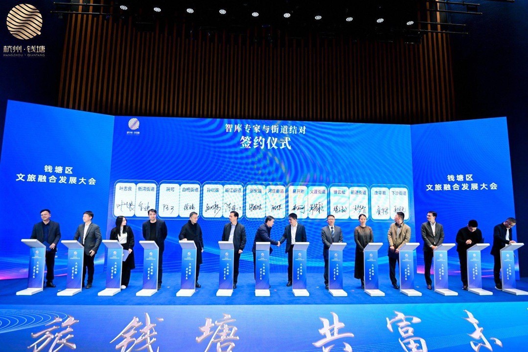 本次大会现场表彰了12家钱塘区文旅行业突出贡献单位;成立了区文旅智库,并聘任了7名区文旅智库专家;举办了“智库专家与乡镇、重大项目以及战略合作”签约仪式,发布了6条钱塘区精品旅游路线。