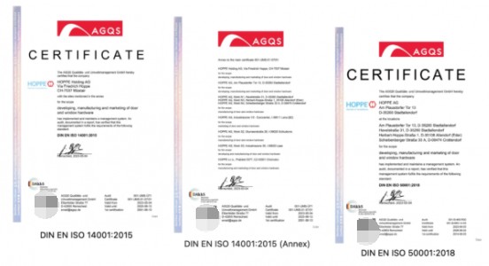 HOPPE好博始终认为:经济效益目标和生态保护之间并不存在冲突。通过谨慎利用现有资源提高资源利用率和尽量避免废弃物的产生,HOPPE好博努力保持环境的健康和可持续性。目前,品牌所在工厂已经通过DIN EN ISO 14001:2015(环境管理体系) 认证,DIN EN ISO 50001:2018(能源管理系统) 认证等环保相关认证。