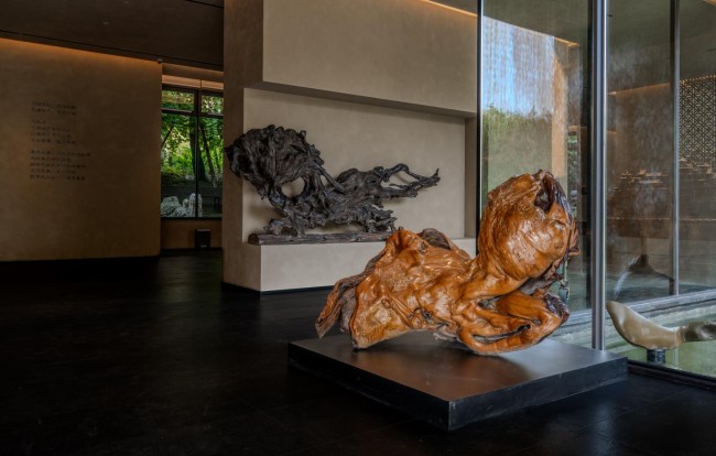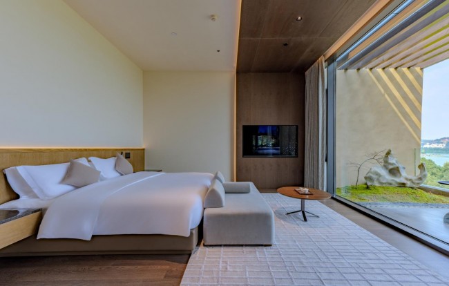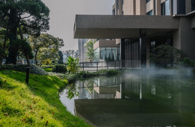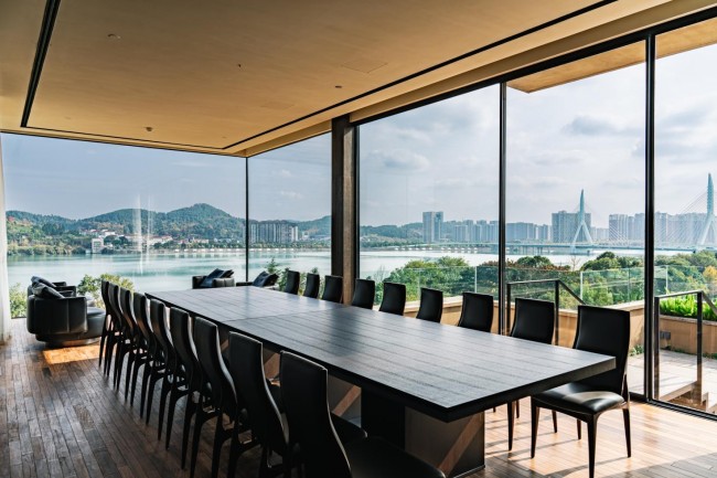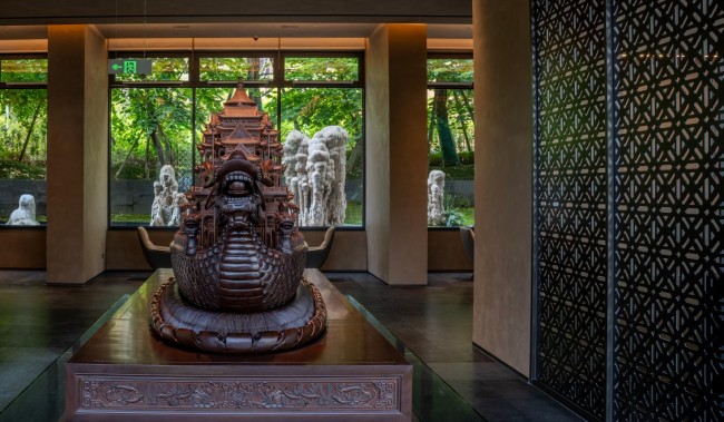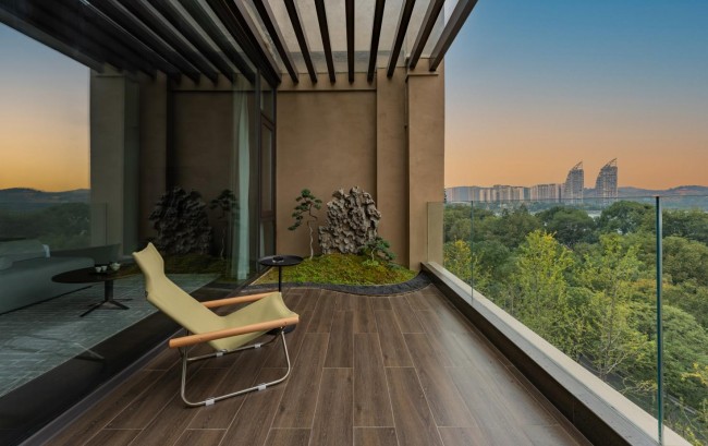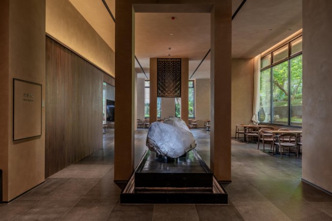 户外,摩尔石、灵璧石、钟乳石与罗汉松、羽毛枫、紫薇等自然元素与抽象艺术相映成趣;室内,彩陶石、水晶、孔雀石等自然艺术珍宝和中国工艺美术大师吴初伟先生的精雕大作点缀其中,与简约轻奢的设计风格及江景、自然美景交相辉映。