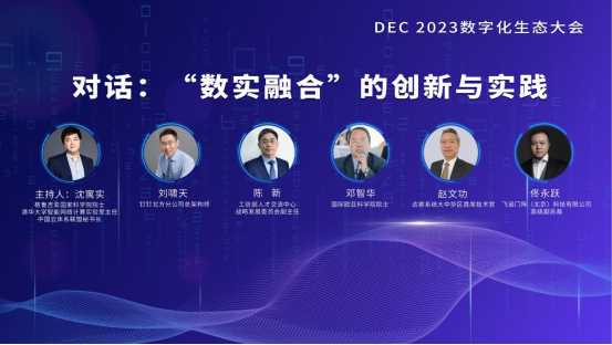 工信部人才交流中心战略发展委员会副主任陈新, 格鲁吉亚国家科学院外籍院士、清华大学智能网络计算实验室主任、中国云体系联盟秘书长沈寓实 , 国际欧亚科学院院士邓智华、 达索系统大中华区首席技术官赵文功, 钉钉北方分公司总架构师刘啸天, 飞诺门阵(北京)科技有限公司高级副总裁佟永跃 就“‘数 实融合’的创新 与实践 ”话题进行了对话。