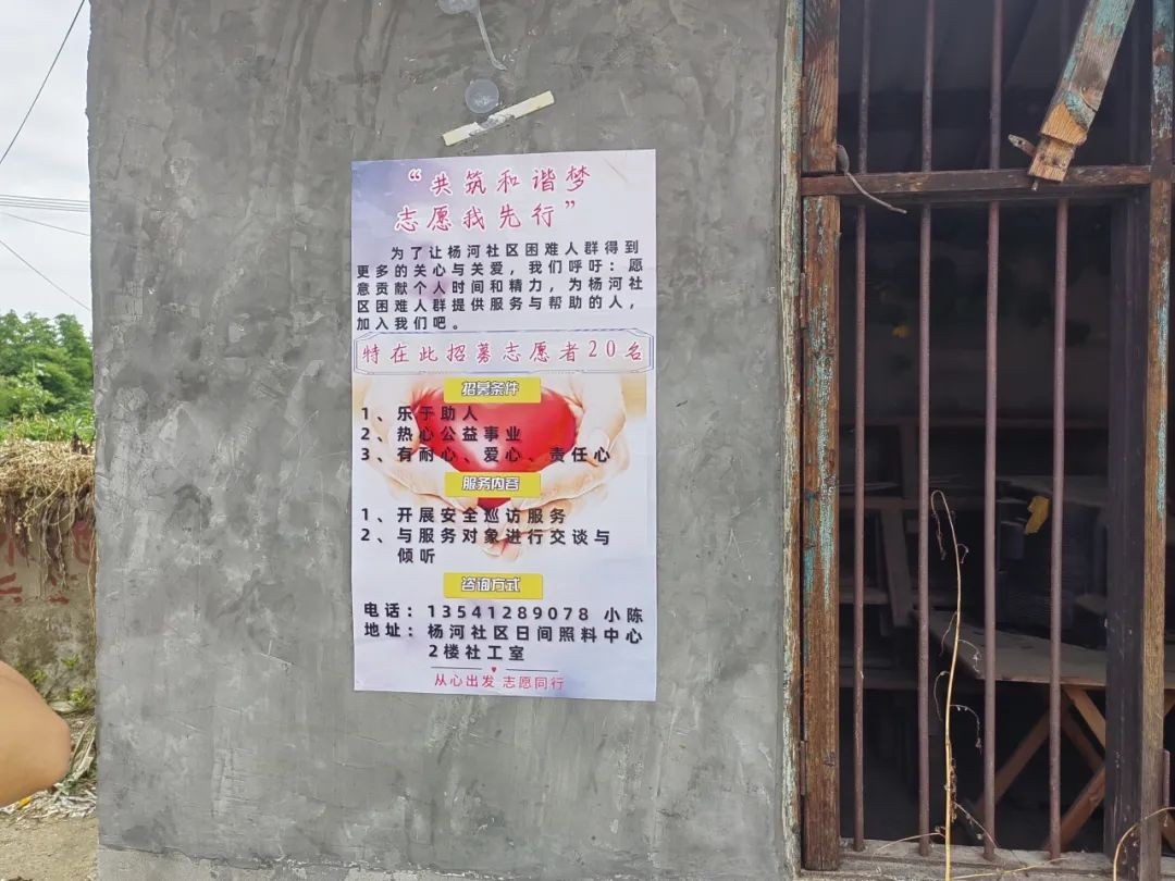 构建“线上+线下”全方位、立体式宣传格局。社工在利用微信公众号、社区网格群等线上渠道向居民群众宣传的同时,线下通过进户入门、挨家挨户走访调研,发放宣传资料,进一步提高群众对志愿服务和困难群众巡访帮扶的知晓率。最终招募并成立了一支人数在20余人,由热心居民、退休村民、大学生、社区自组织成员组成的杨河社区社工室志愿者服务队伍。