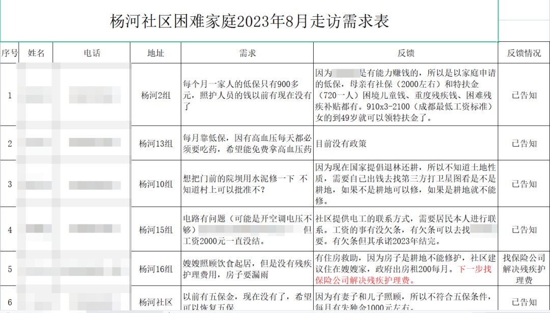 以“五社联动”为核心,根据“135”的社工室运营思路,志愿者服务队伍入户开展困难群众摸排活动,主动了解发现记录群众的“急、难、愁、盼”问题,通过与困难群众面对面交流,收集困难群众的问题诉求,并梳理形成困难群众需求清单,经社区核实、队伍讨论后形成下一步服务清单,建立台账。同时,在走访过程中,建立社区资源清单,通过激活杨河资源,发挥社区能力在社区治理、公共服务中的作用,增强基层多元参与、协商共治能力。