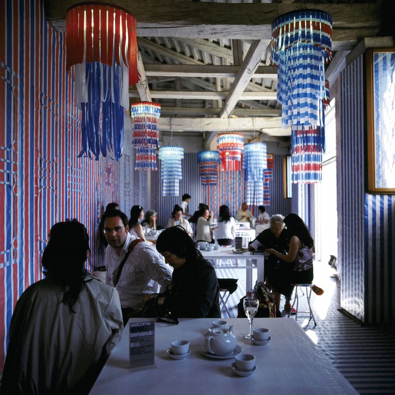 早在2005年,又一山人曾在第51届威尼斯双年展上,将广府港人的「早茶」文化带到意大利。那是网络刚刚兴起的年代,又一山人敏锐地感知到人与人之间真实的连接开始消解。他在威尼斯建起「红白蓝茶馆」,希望在广府人最质朴的茶馆中,重新编织起人与人之间的联系,找到解决问题的契机与社会的凝聚力。