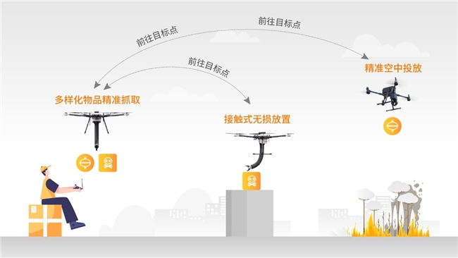 参考案例:公共安全场景中,工作人员可远程操控猎户座 Orion 出发前往突发事故所在点,根据远程安全指挥,稳固抓取投放危化品至无人安全区域进行处理,或远程稳固抓取公共安全设施前往事故地,以最安全、快速的方式从空中转移危险品或各类安全设施,最大程度降低城市突发事件带来的社会影响,保障城市安全。
