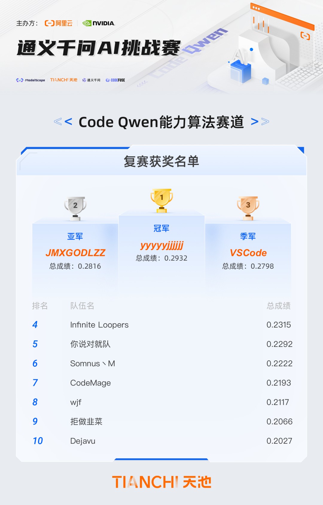 在通义千问AI挑战赛 - Code Qwen能力算法赛道上,众多参赛者凭借其卓越才智,在激烈的初赛和复赛中表现出色。编程能力是大型模型的关键能力之一,高效的生产效率不仅有助于提高有限算力的利用率,也可以加速对模型的迭代,主办方期待未来有更多基于大型模型的编程助手能够提高生产效率,成为不可或缺的智能化工具。