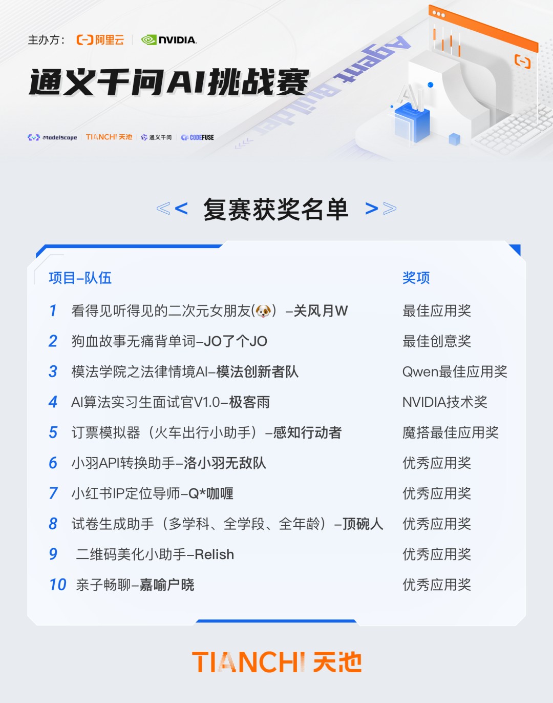在通义千问AI挑战赛 - Agent Builder应用赛道上,作品创意涵盖游戏、教育、法律、金融、工业等10多个领域,通过技术难度、应用前景、交互体验、人气值等维度决选出了10支团队及其作品来到线下进行复赛路演,最终由技术、业务、投资领域组成的专家团评选出最佳应用奖、最佳创意奖等6个奖项。