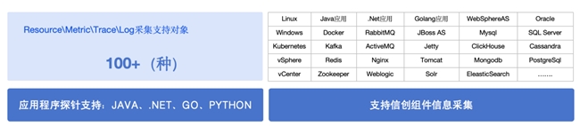 支持100+种常见资源与技术栈的自动发现、指标、链路、日志的采集。其中包括服务器、数据库、K8S、web中间件、消息中间件、java应用框架等。同时支持常见信创资源与技术栈。