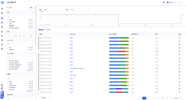 链路分析承载着丰富的分析与查看功能。用户可以从不同视角出发,深入剖析系统、服务、接口以及数据库等的运行状态,还能够轻松查阅链路、错误、span属性以及资源信息等上下文关键信息,从而全面掌控应用服务的运行细节,确保系统的高效稳定运行。