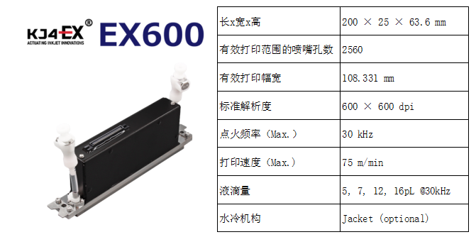 京瓷EX系列喷墨打印头的水性600dpi分别有EX600和EX600RC,其中EX600喷头与之前的QA喷头尺寸几乎一致,可与原有的产品互换。而EX600RC为循环喷头,打印速度可高达40kHz,且该喷头自带水冷夹,即使是在高Duty的连续印刷下也可以维持其稳定性。