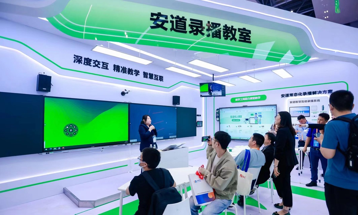 让教学不受时空限制,助力数字化校园建设。在中央大厅里,安道录播教室呈现灵活的空间布局,以自研信息技术为基础,为师生搭建起云端共享桥梁,让高质量课堂突破教室空间。在教装展现场,安道录播互动主机、云课堂等软硬件设备,多角度体现高效直播、互动教学、课后点播、网络教研、智能巡课等核心应用,让每位参展者深刻感受常态化录播教学场景带来的无限可能。
