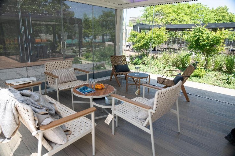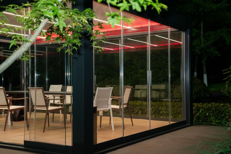 点击“OMBRA欧铂纳智能观景棚”中控屏的“启动”按钮,四周碳灰色的卷帘门缓缓上升,展现出一个四面通透的玻璃空间,内置沙发、茶几、餐桌、餐椅等户外家具一应俱全。
